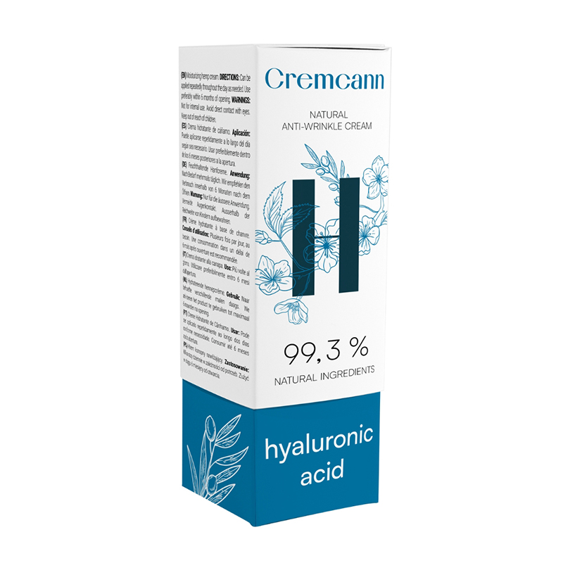 CREMCANN HYALURON es una crema hidratante natural para la hidratación diaria de la piel con alta concentración de Ácido Hialurónico de alto y bajo peso molecular diseñada para rellenar las líneas de expresión y arrugas profundas, apta para aplicar también como contorno de ojos. Su nueva presentación con envase airless permite una mejor conservación de sus principios activos naturales y hace mucho más cómoda su aplicación.