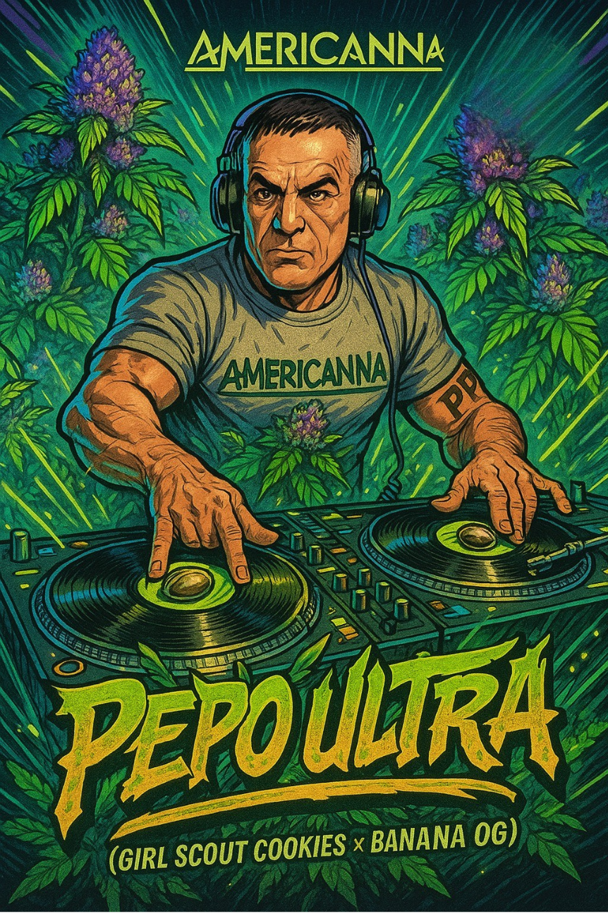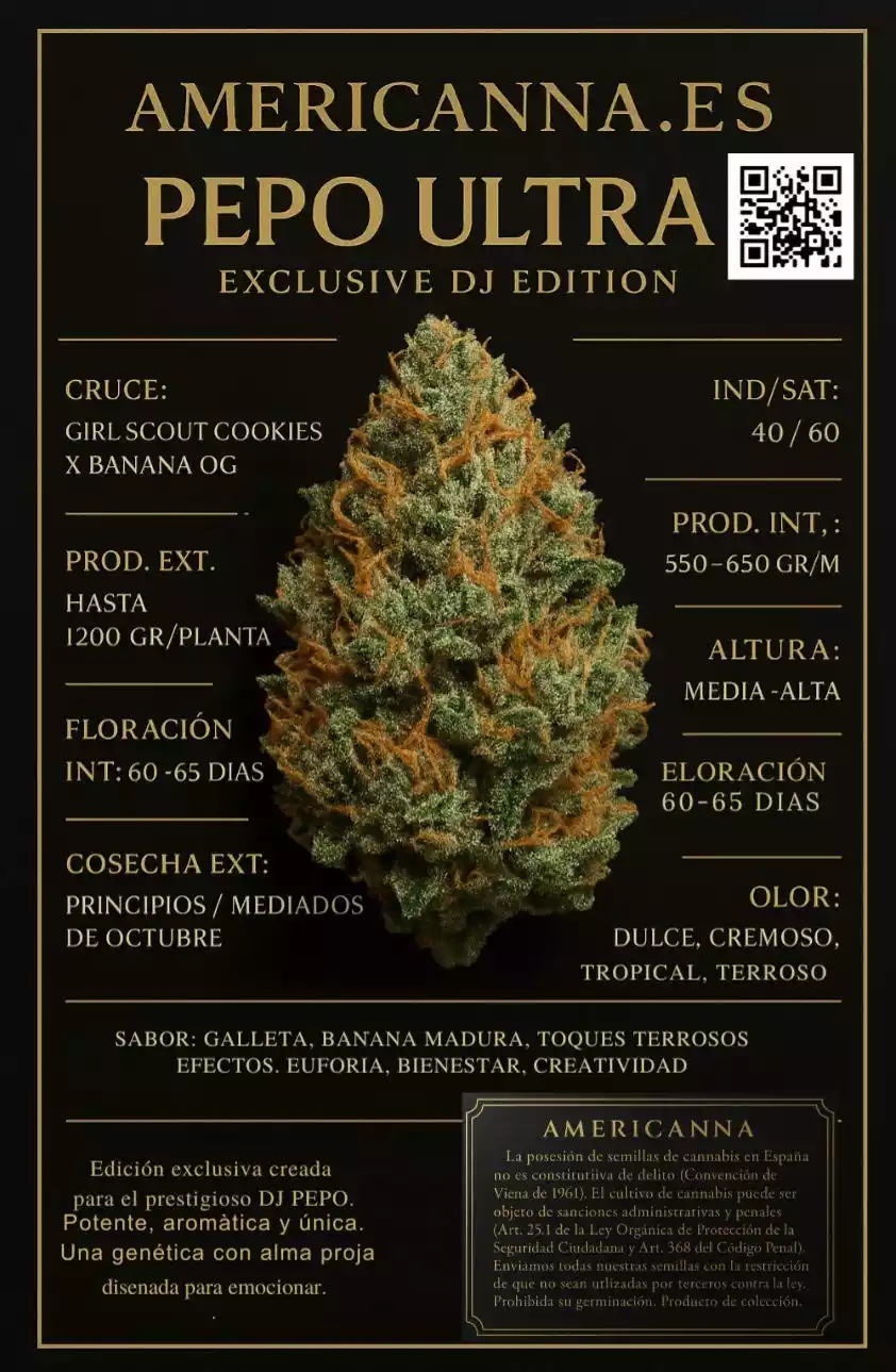 Es una genética única creada exclusivamente para DJ PEPO, combinando la potencia resinosa de Girl Scout Cookies con la dulzura tropical y la pegada intensa de Banana OG. Su perfil aromático es profundo, dulce y cremoso, con marcadas notas terrosas y afrutadas. Produce efectos alegres, energéticos y muy creativos, ideales para conectar con la música y el ritmo. En cultivo es estable, robusta y agradecida, perfecta para obtener cogollos densos, brillantes y muy aromáticos. Una variedad de élite diseñada para coleccionistas que buscan algo verdaderamente exclusivo.